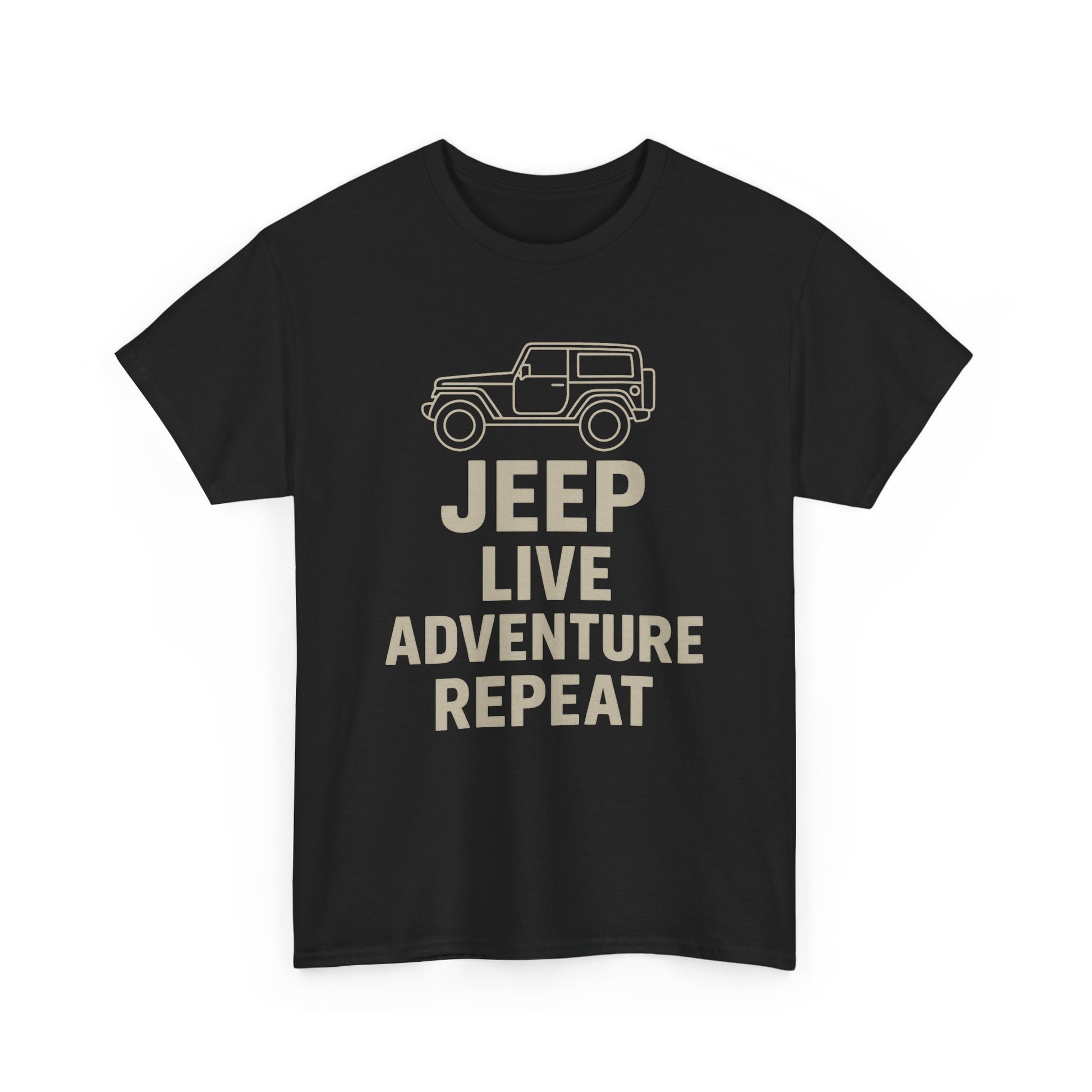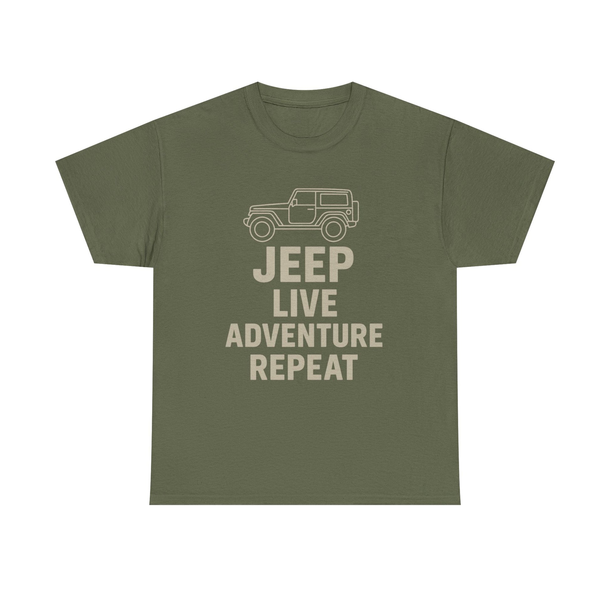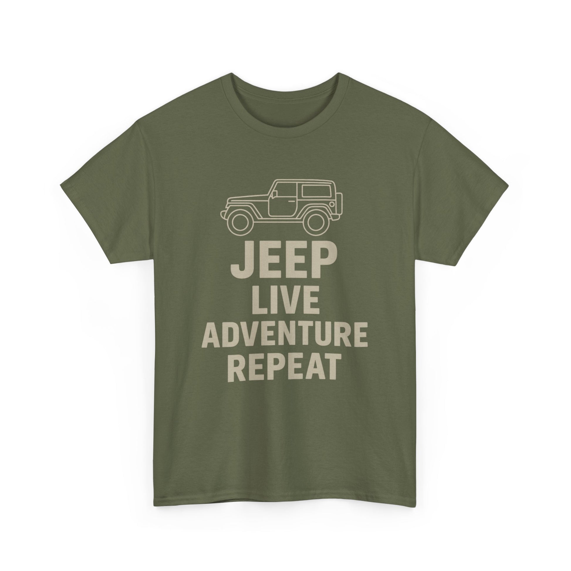 Slide into dirt, sunrise, and wide-open trails with this relaxed-fit tee made for Jeep owners who chase the next horizon. The straight lines of the jeep illustration and bold stacked text — “JEEP / LIVE / ADVENTURE / REPEAT” — speak to days spent navigating back roads, camping under stars, and laughing with friends around the tailgate. The medium-weight cotton feels substantial without being bulky, and the classic crew neck keeps the look timeless. Wear it after a long day on the trail or layered for cool evenings beside the fire — it’s built to accompany the next route you choose.