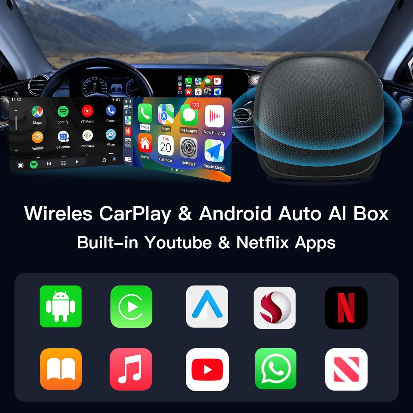 - CarPlay/Android Auto Wireless: Switch freely! Compatible with iPhone/Android! Even if your family has different smartphones, you can still use one with them! Connect once and automatically connect after the next engine start.(*This product does not have a GPS function, so maps downloaded from the Play Store cannot be used. If you need a map, please use the map on your mobile's carplay.)